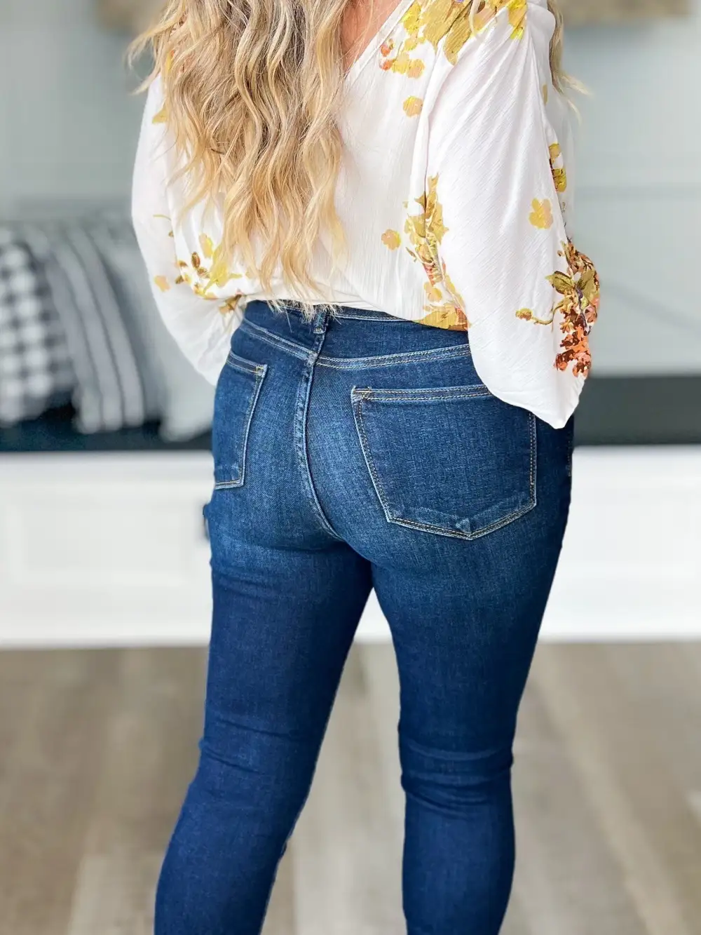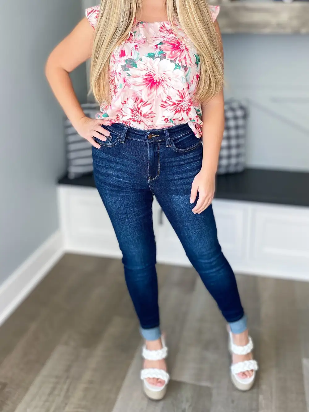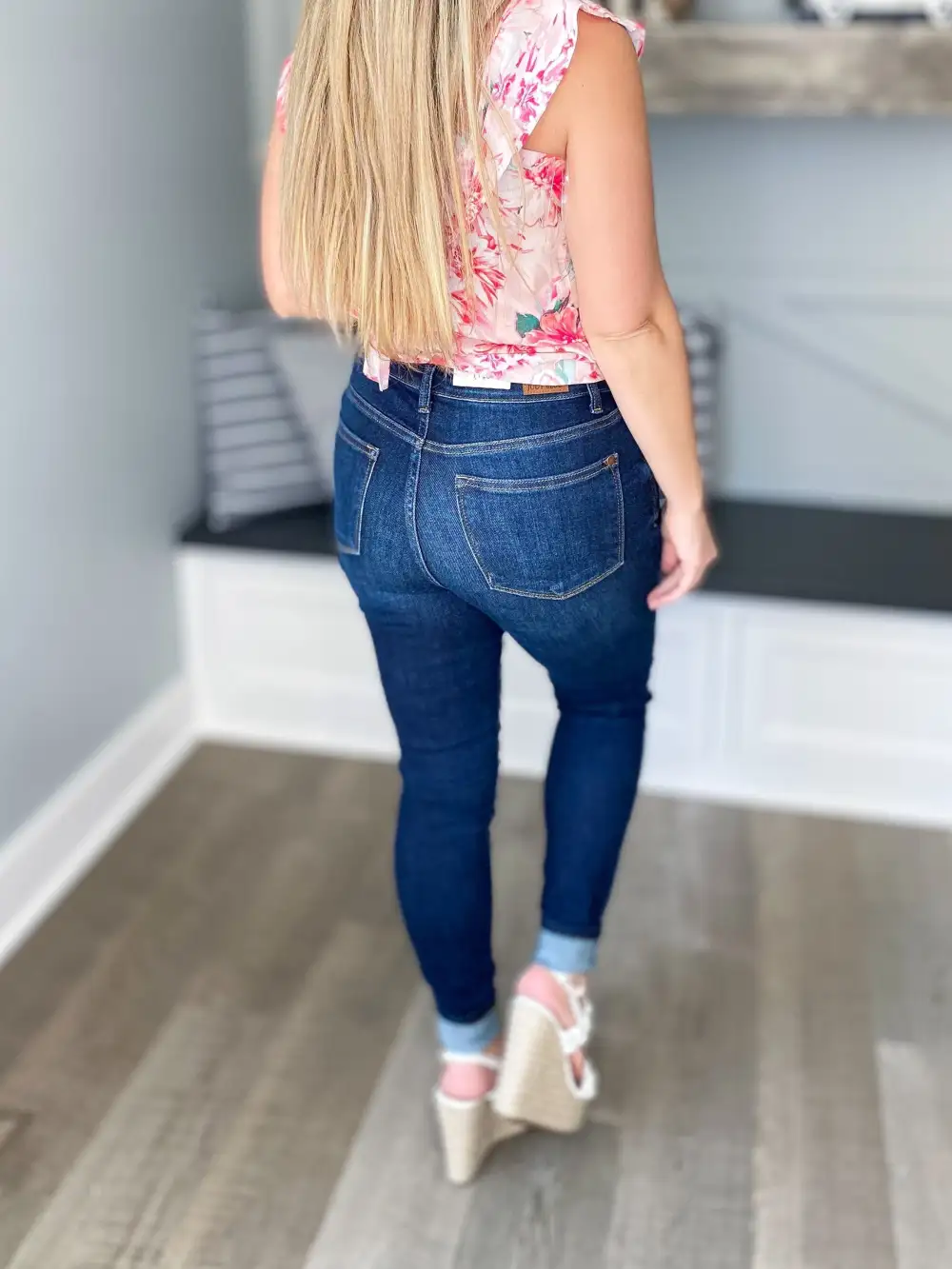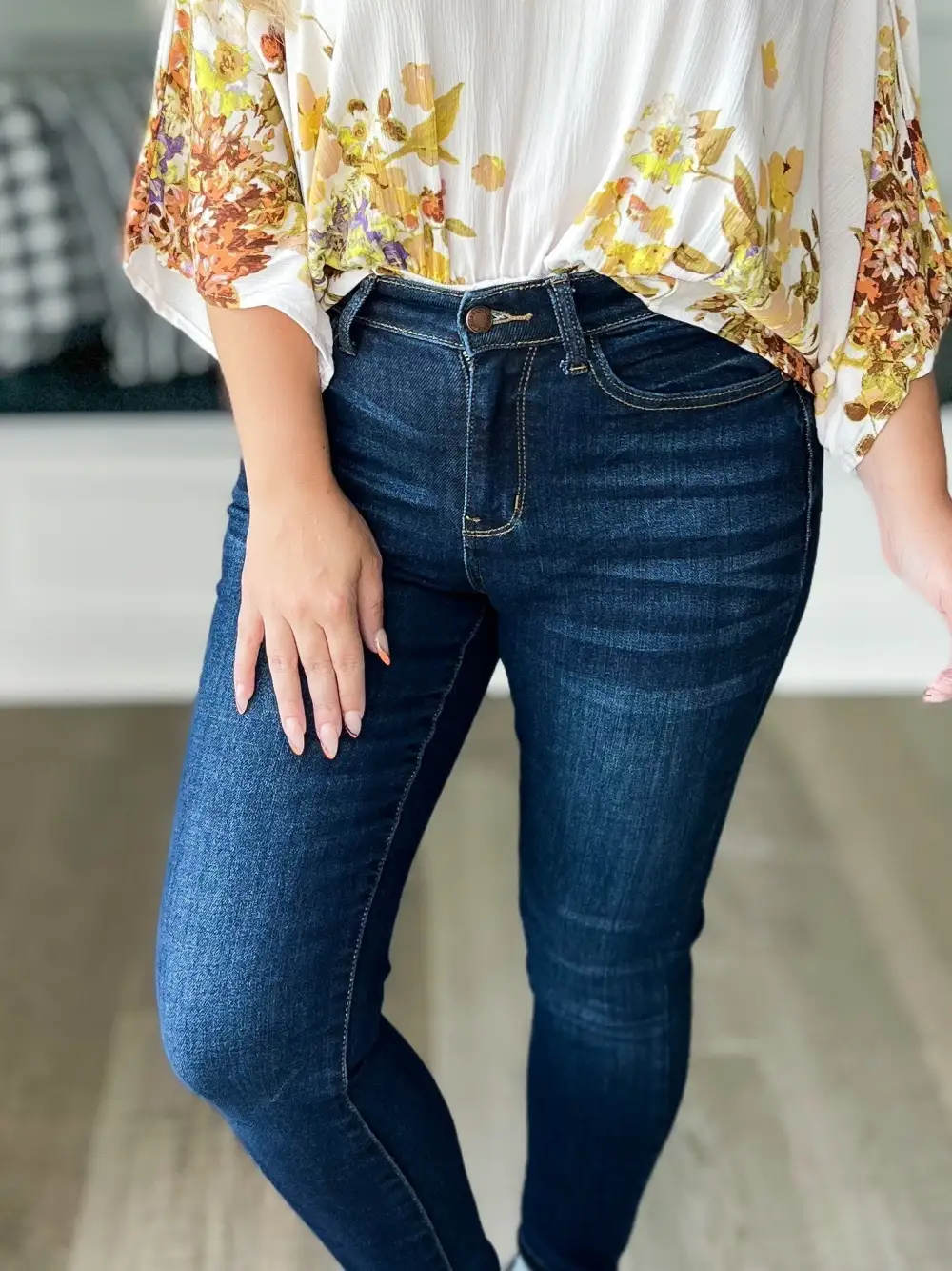 We suggest sticking with your true Judy Blue size shown above for the perfect fit.