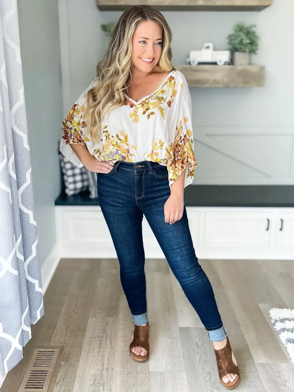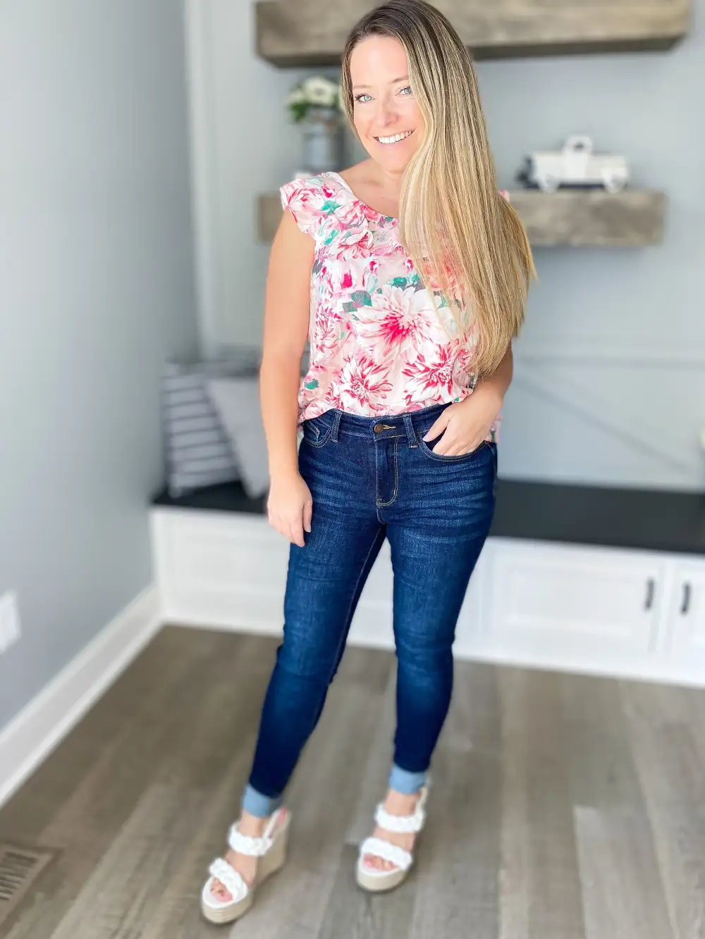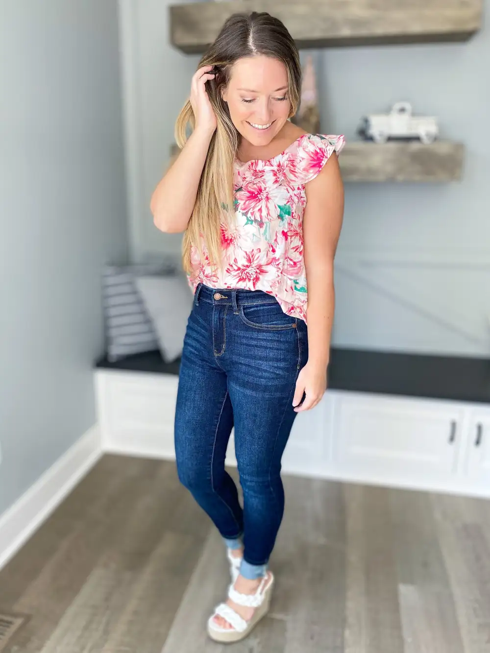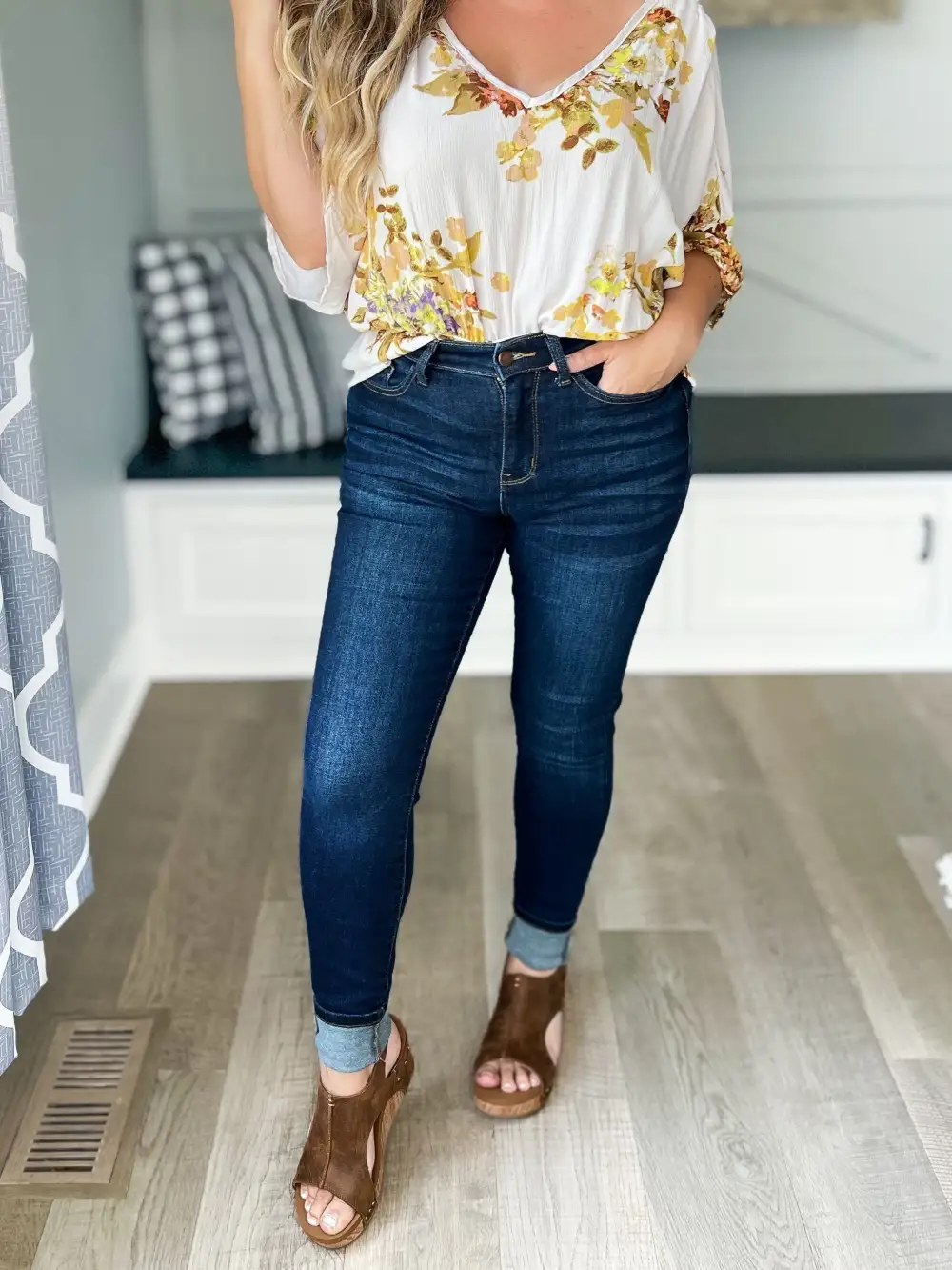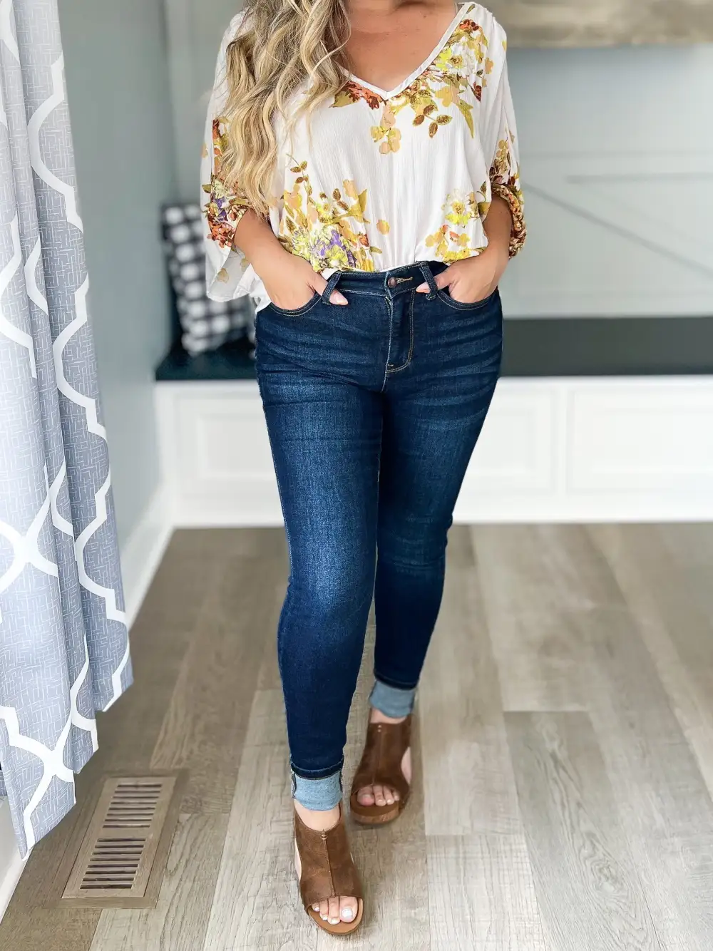 We suggest sticking with your true Judy Blue size shown above for the perfect fit.