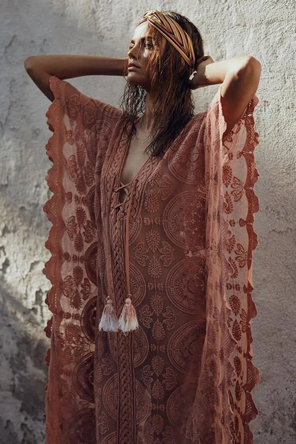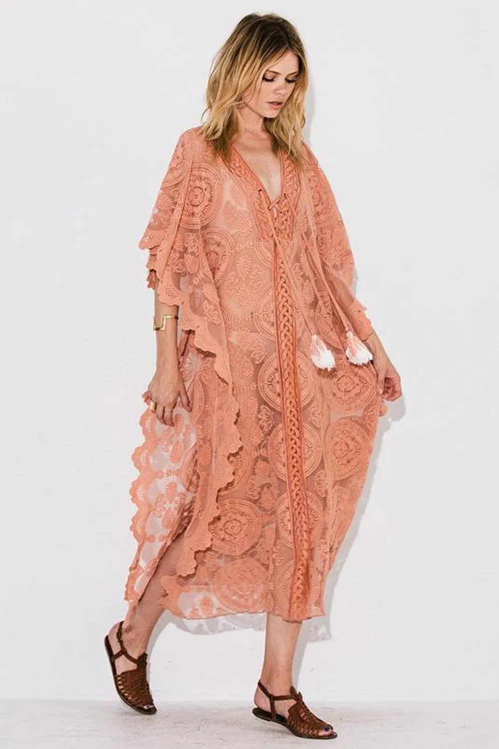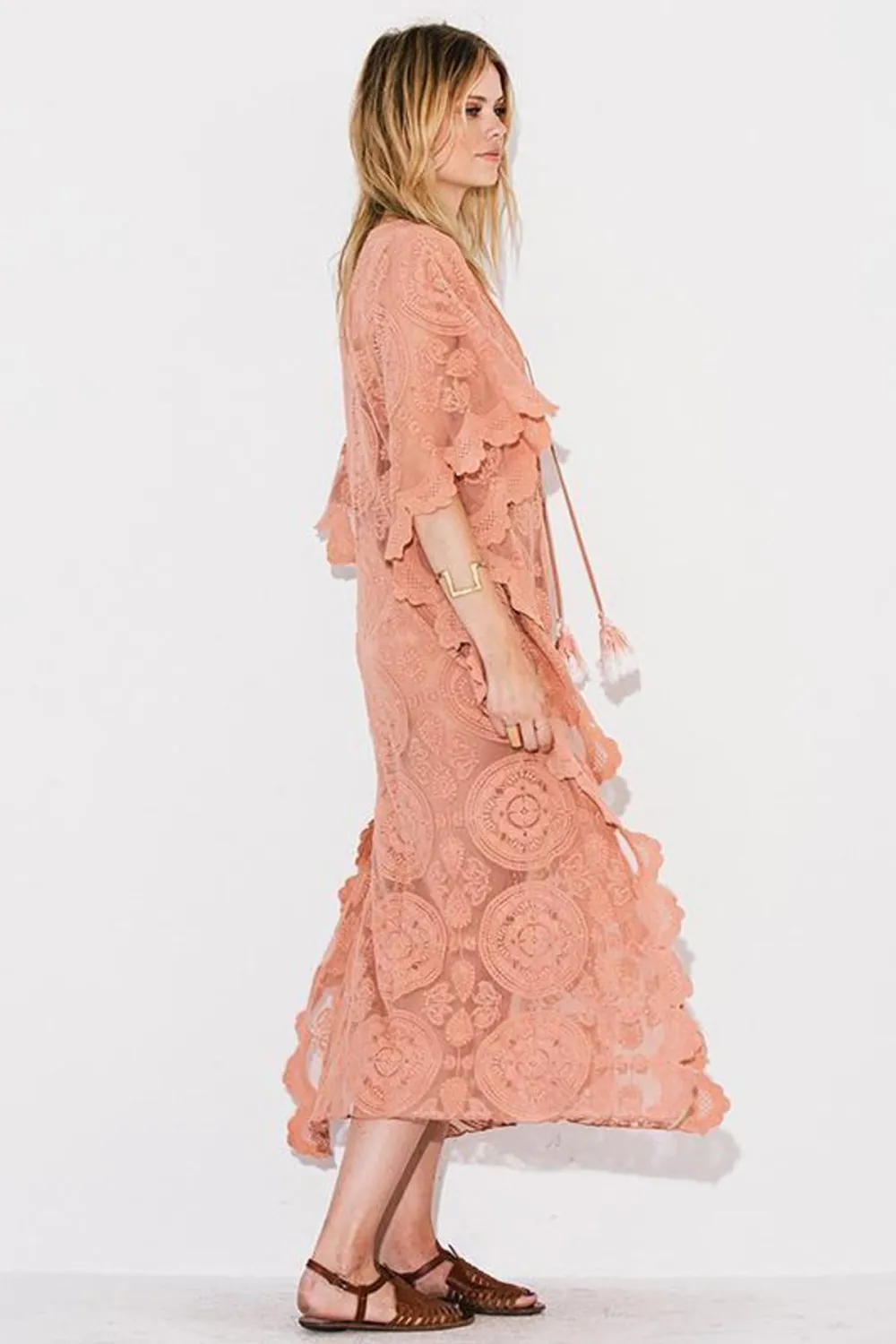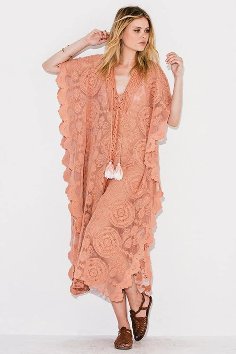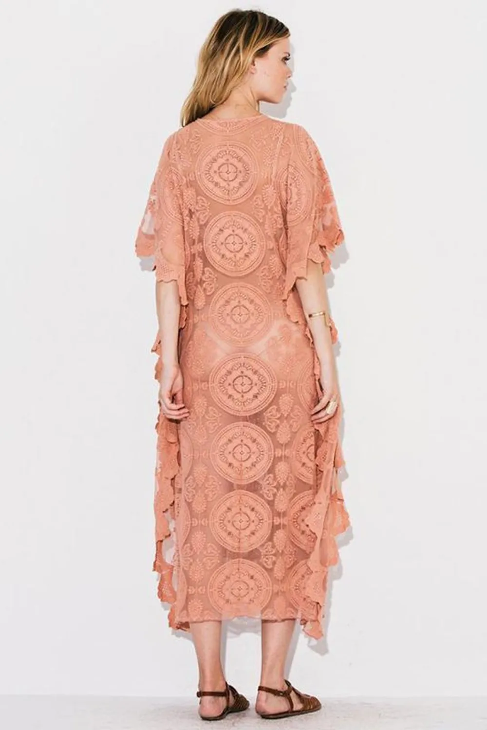 • Mandala Mykonos Kaftan Blush Pink Lace Robe Extra Long Sheer Temptation Blouse