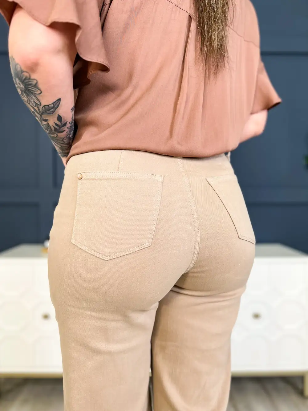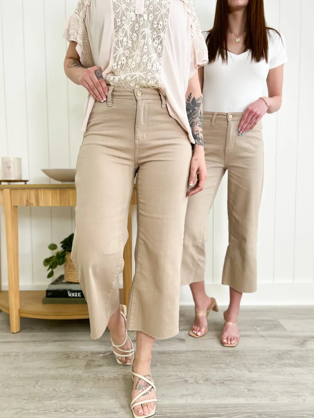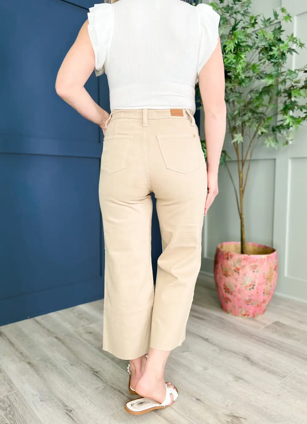 These wide leg khakis are an amazing neutral pair that you are going to get SO much wear out of! With a high waist and a cropped fit, they are so dang figure flattering! Add in that gorgeous non distressed garment dyed denim and they are the MUST have jean of the year!