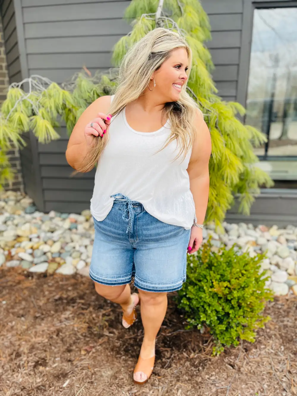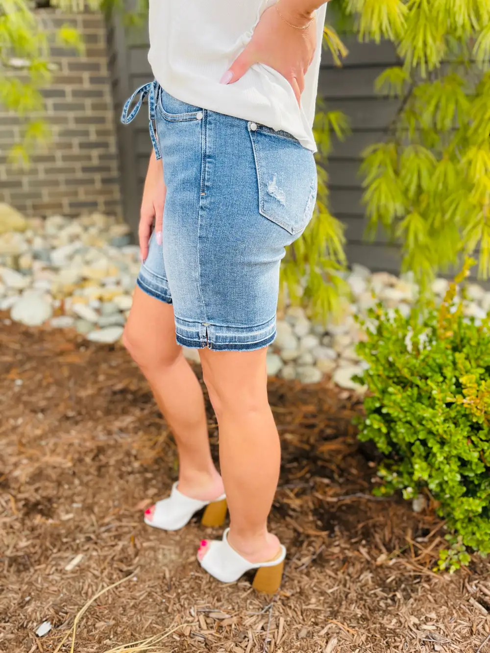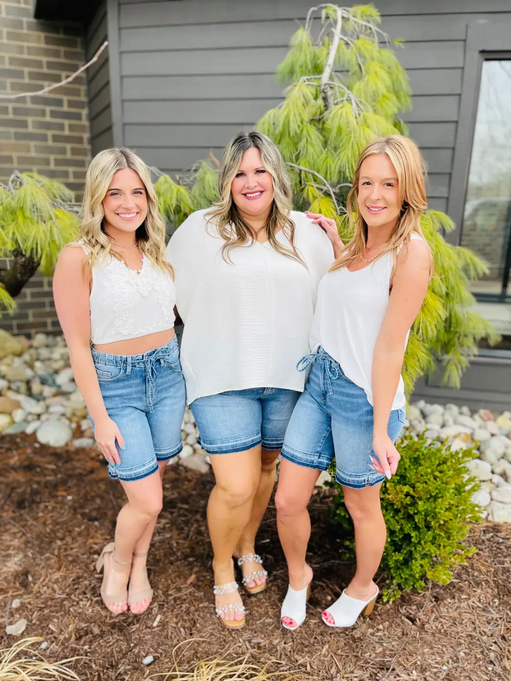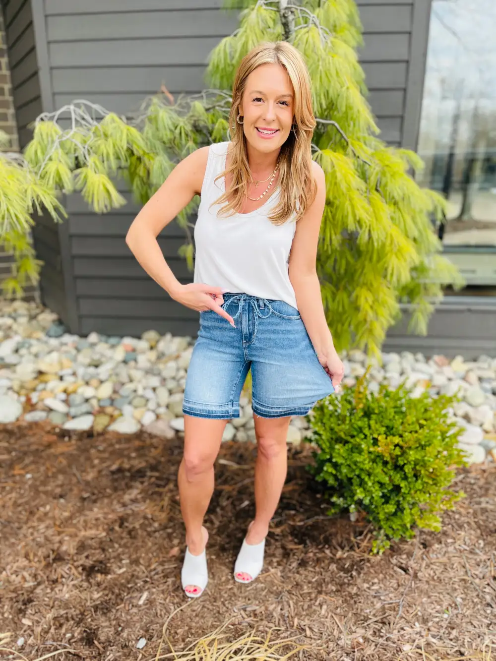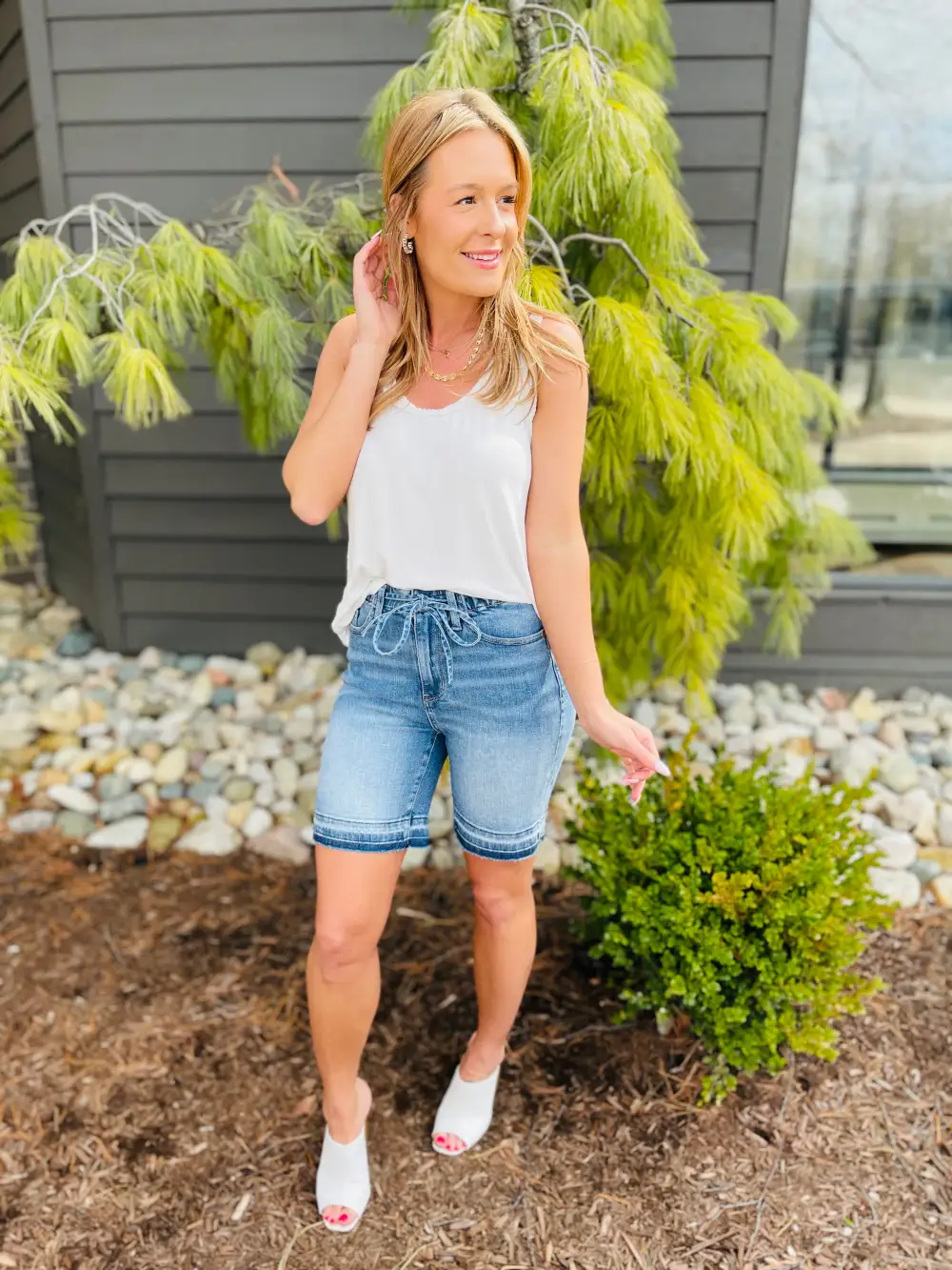 We love that these shorts have it all- they're stylish, versatile, and flattering! Featuring a cute drawstring waist and a completely non-distressed medium wash, these shorts offer a trendy look you can dress up or down.