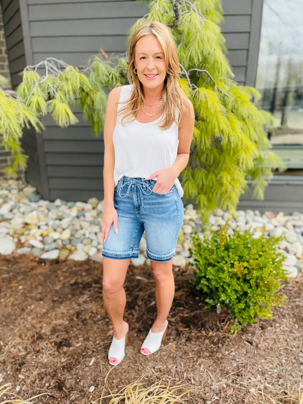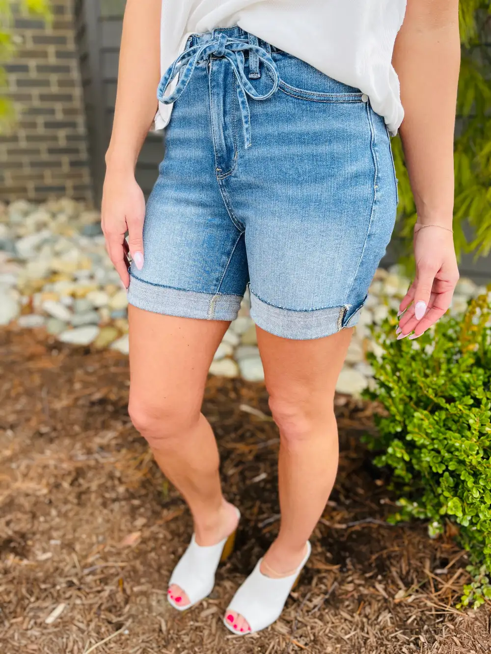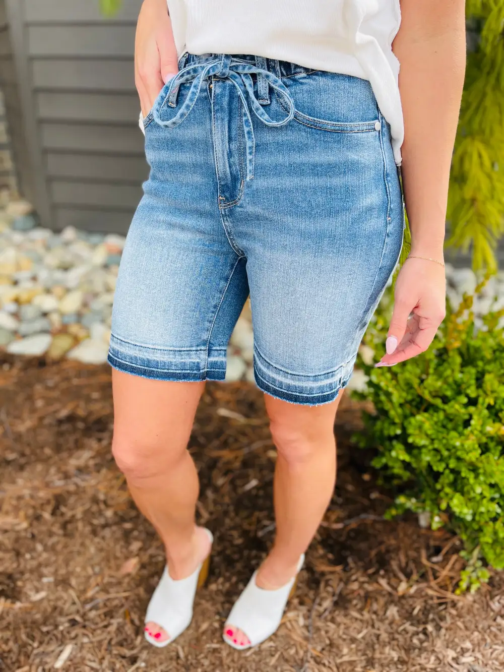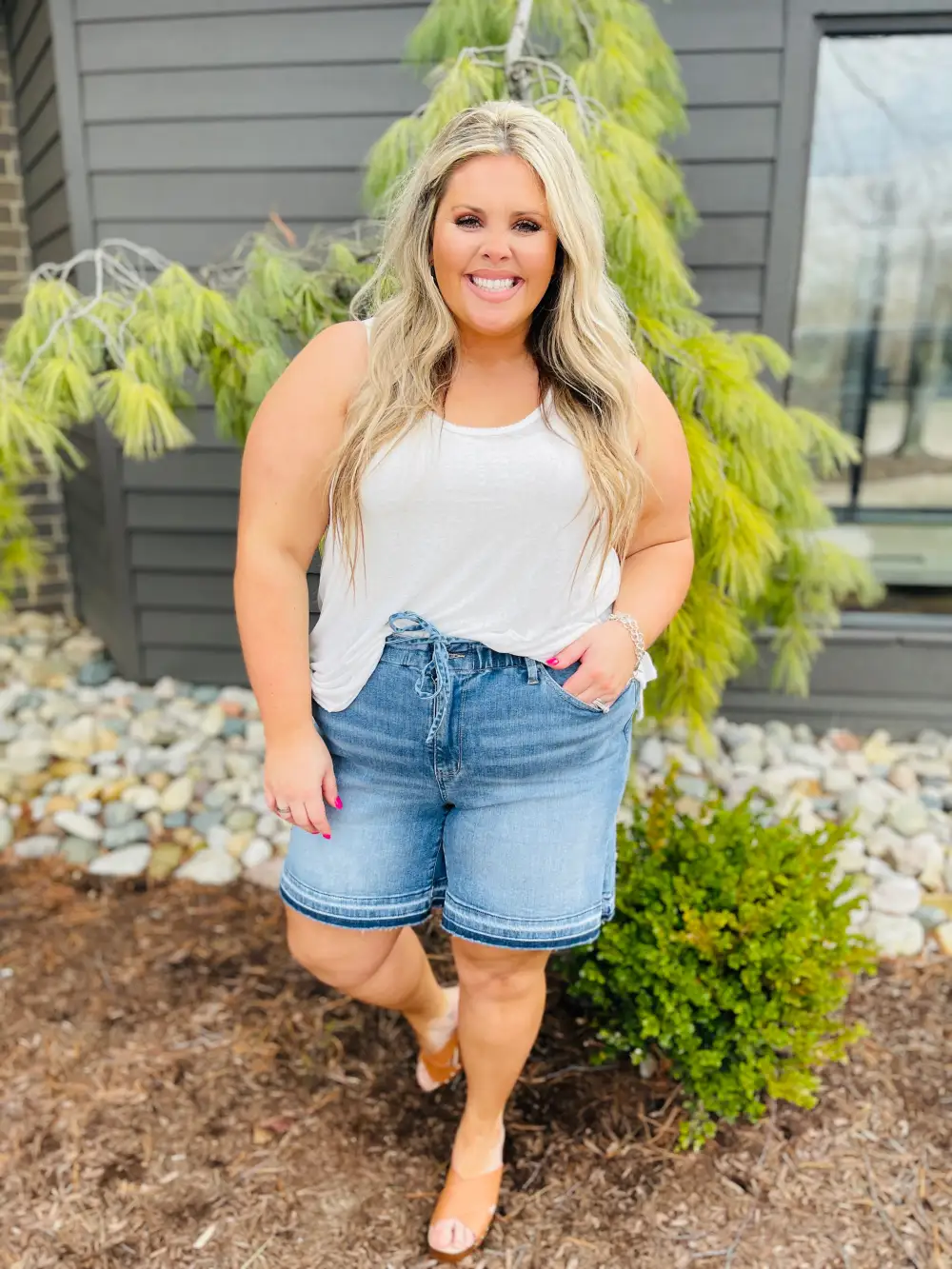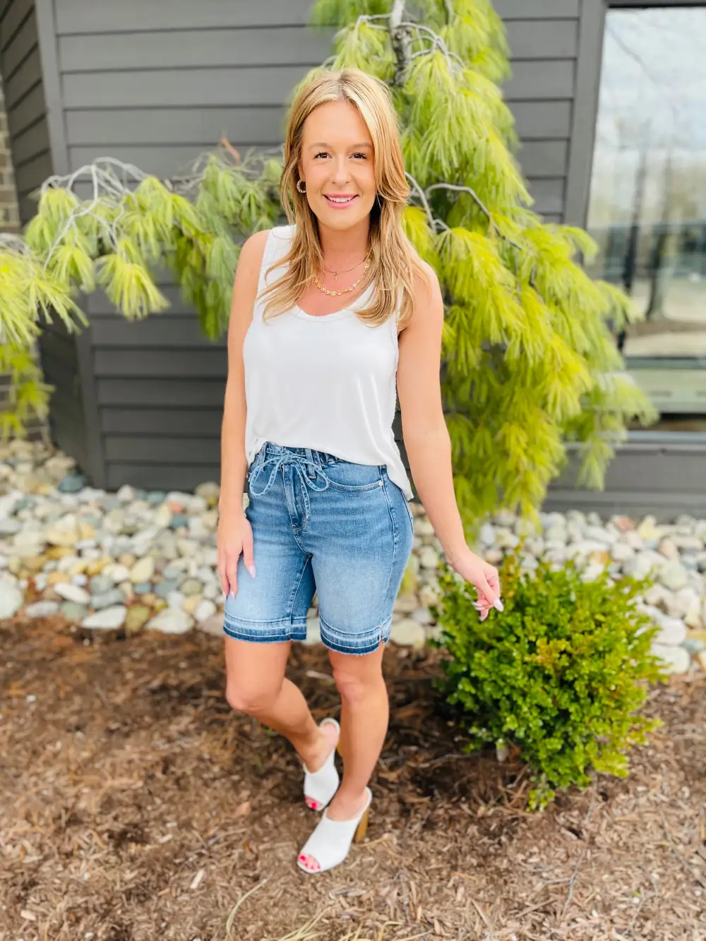 We love that these shorts have it all- they're stylish, versatile, and flattering! Featuring a cute drawstring waist and a completely non-distressed medium wash, these shorts offer a trendy look you can dress up or down.