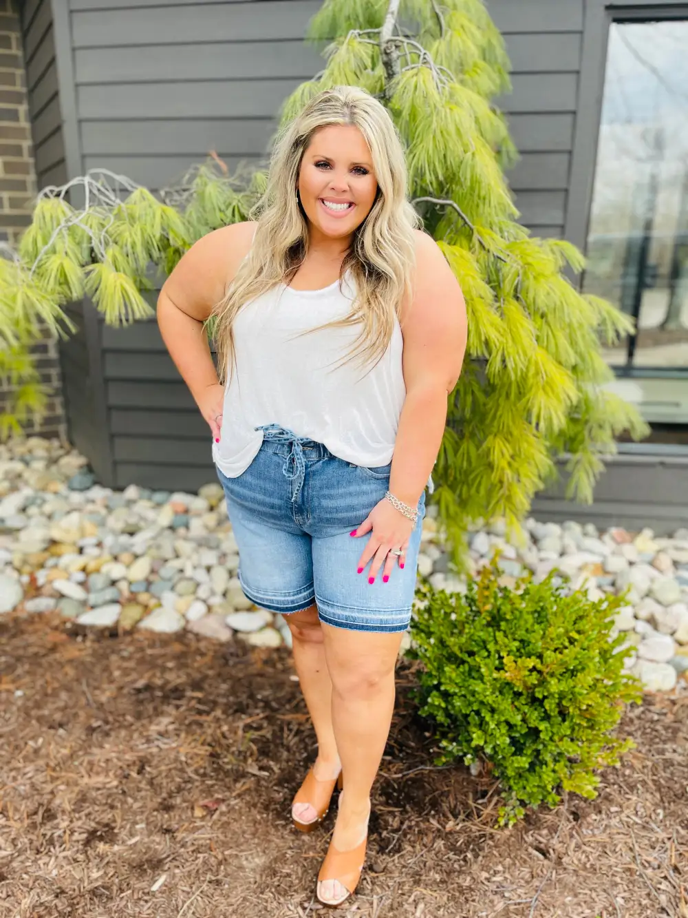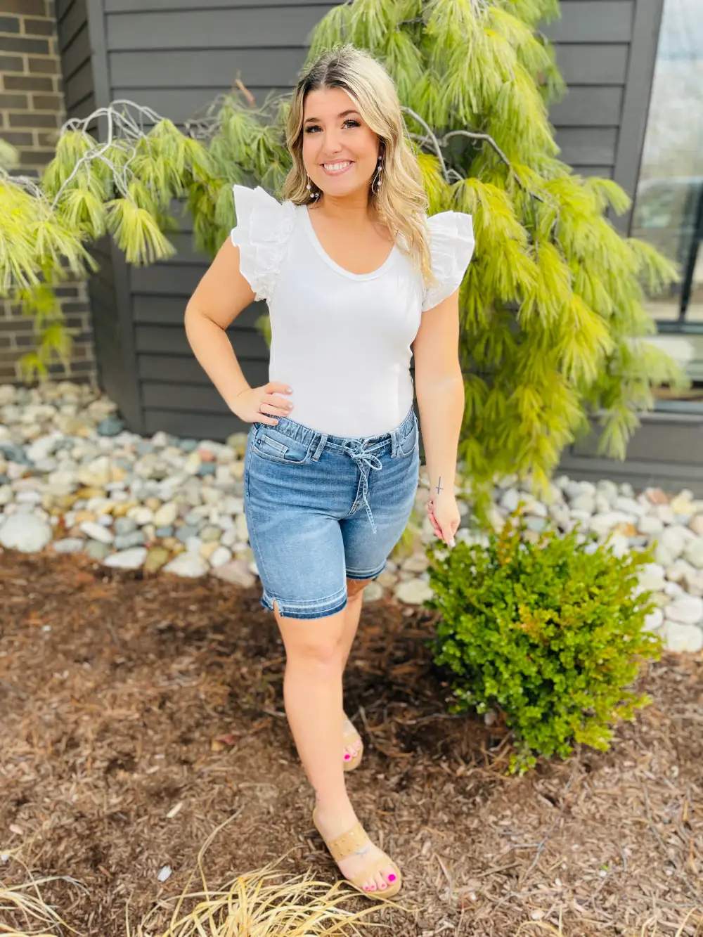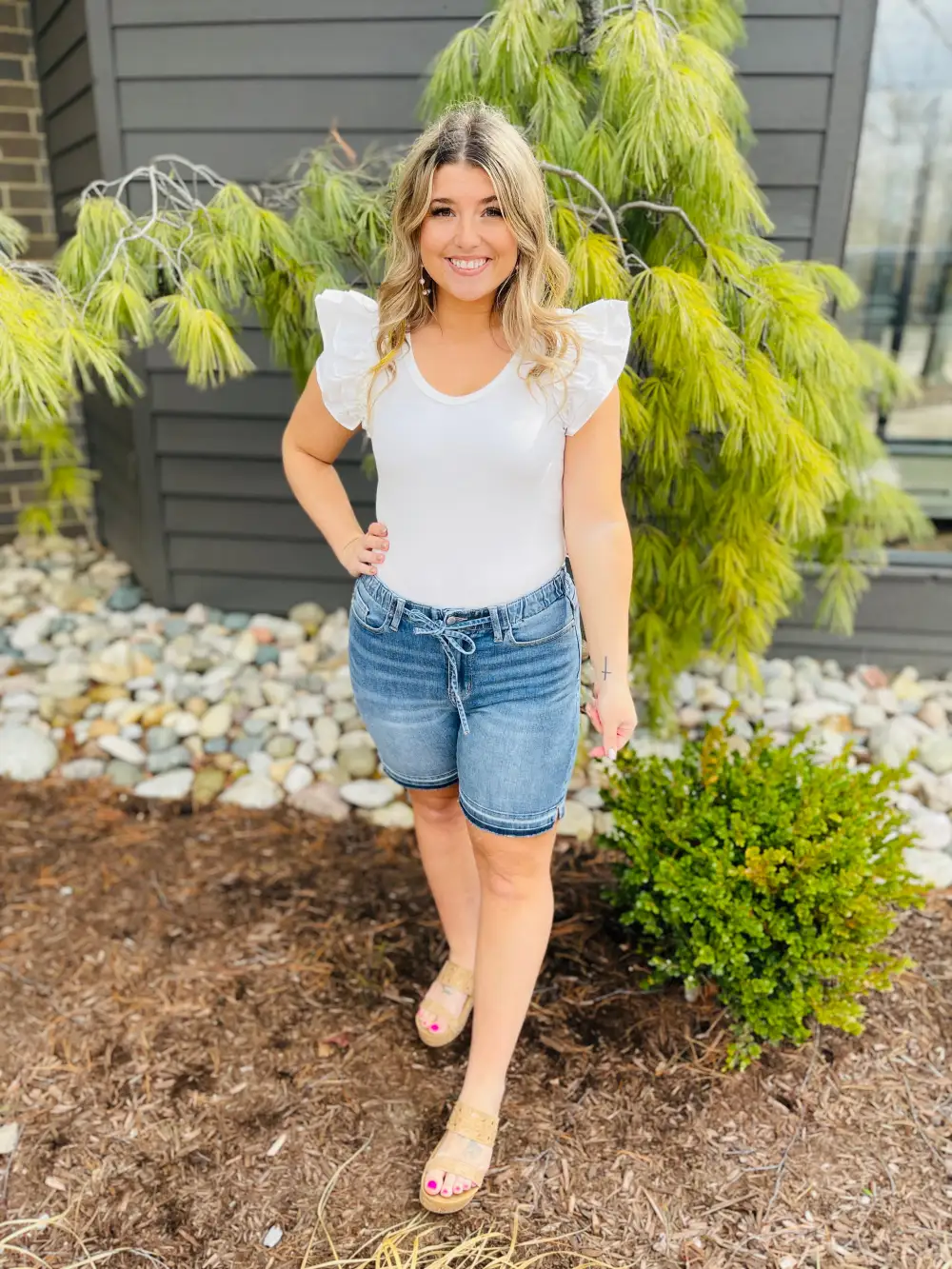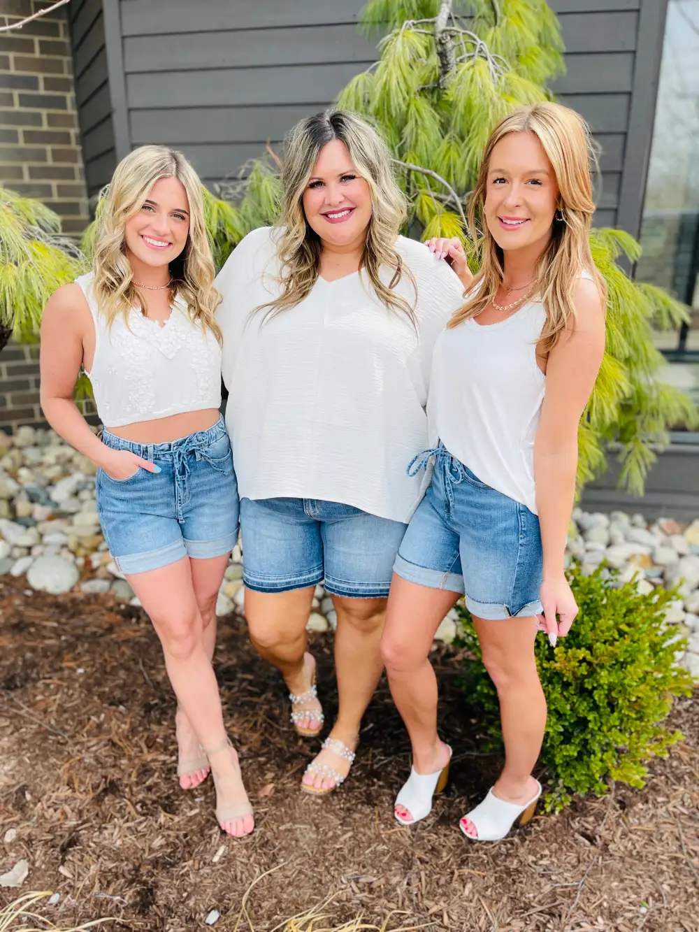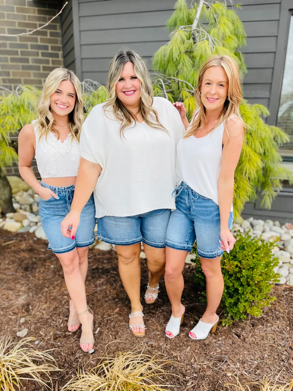 We love that these shorts have it all- they're stylish, versatile, and flattering! Featuring a cute drawstring waist and a completely non-distressed medium wash, these shorts offer a trendy look you can dress up or down.