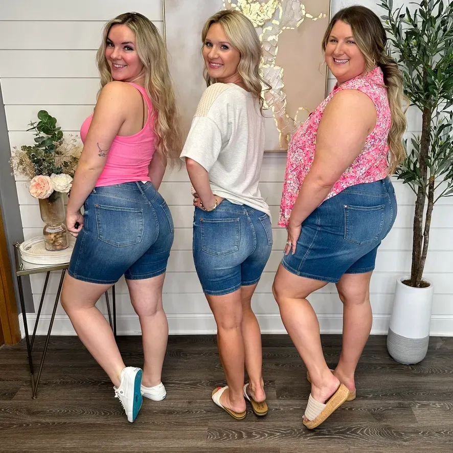 • Sara Tummy Control High Rise Double Button Medium Wash Bermuda Shorts
